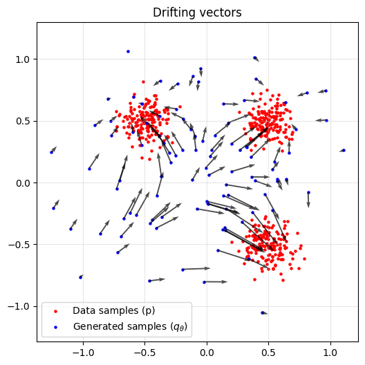 \[V_{\pi,k}(x) \approx \frac{\sum_{j=1}^N k(x, y_j)y_j}{ \sum_{j=1}^N k(x, y_j)} - x\,.\]The drifting field $\Delta_{p,q_\theta}$ is then defined as